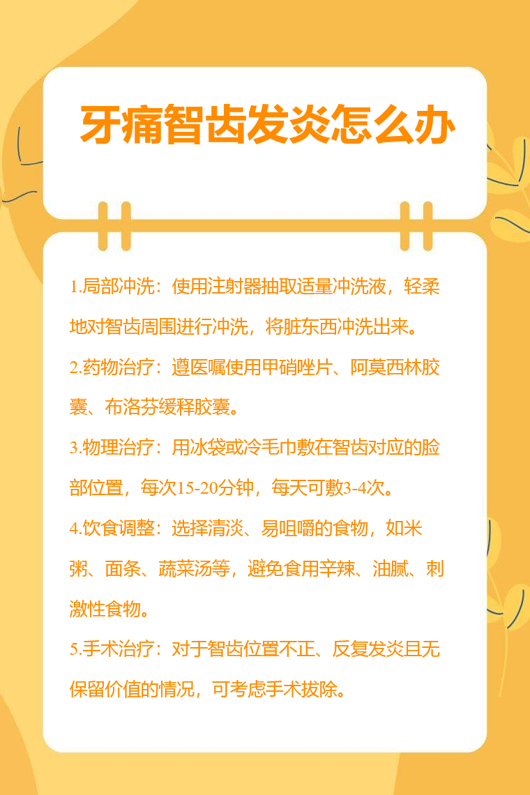 牙痛智齿发炎可以通过局部冲洗、药物治疗、物理治疗、饮食调整、手术治疗等方法来缓解。