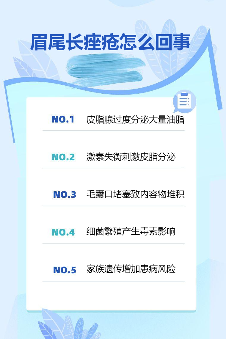 1. 皮脂腺分泌旺盛:皮脂腺分泌过多油脂,无法及时排出,就容易在眉尾处积聚,为痤疮的产生创造了条件。当皮脂腺受到某些因素刺激,比如青春期激素水平变化、饮食过于油腻辛辣等,会导致分泌功能亢进,过多的油脂与角质等混合,堵塞毛孔,进而引发痤疮。