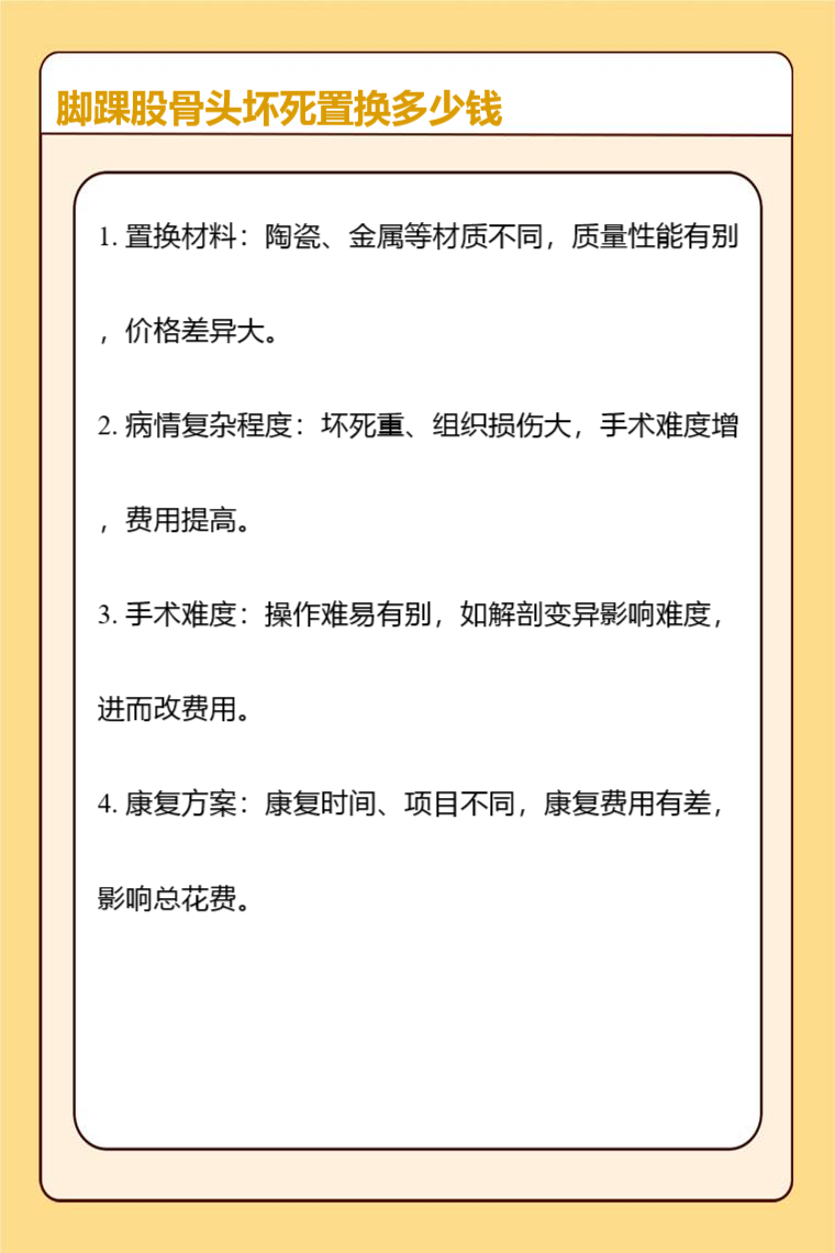 脚踝和股骨头坏死置换的费用不同,脚踝置换一般在30000元到80000元,股骨头置换在50000元到120000元,存在个体差异性 。影响费用的因素有置换材料、病情复杂程度、手术难度、康复方案等。