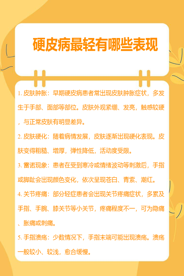 硬皮病最轻的表现有皮肤肿胀、皮肤硬化、雷诺现象、关节疼痛、手指溃疡等。