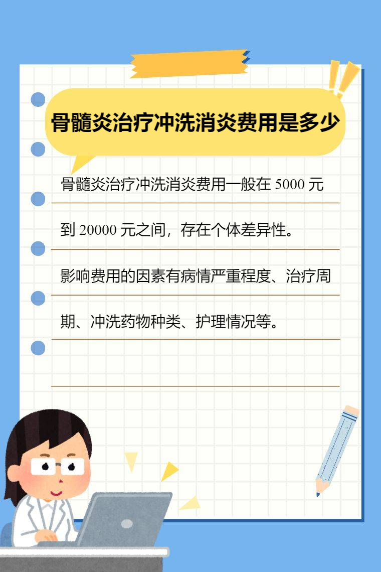 骨髓炎治疗冲洗消炎费用因多种因素而异,一般在 5000 元到 20000 元之间,存在个体差异性。影响费用的因素有病情严重程度、治疗周期、冲洗药物种类、护理情况等。