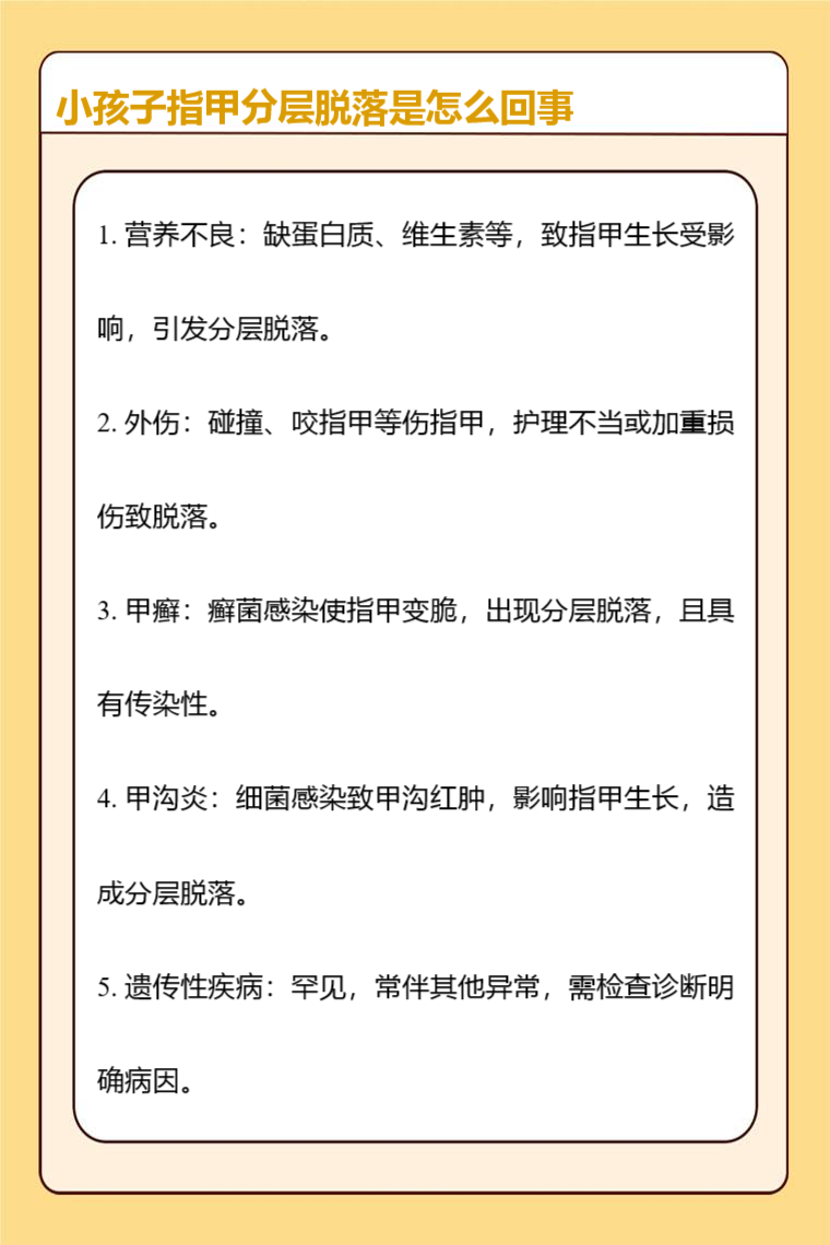 小孩子指甲分层脱落可能是由营养不良、外伤、甲癣、甲沟炎、遗传性疾病等引起。