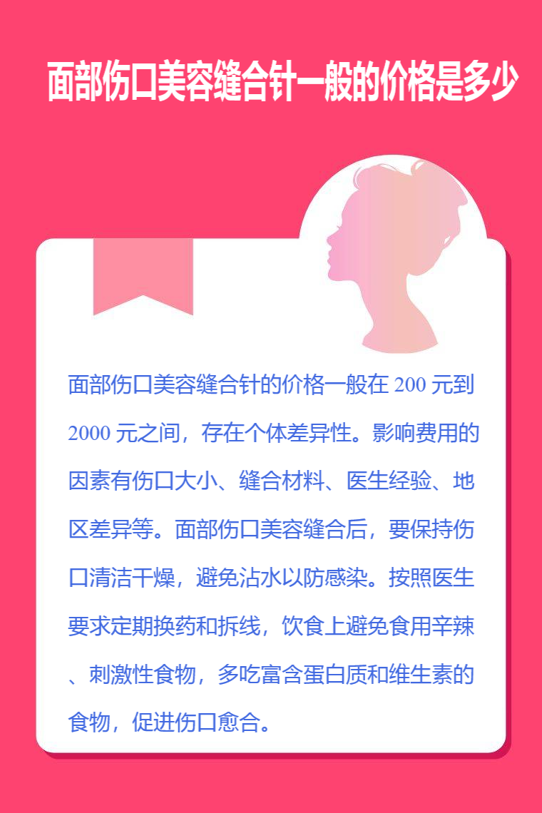 面部伤口美容缝合针的价格一般在 200 元到 2000 元之间,存在个体差异性。影响费用的因素有伤口大小、缝合材料、医生经验、地区差异等。