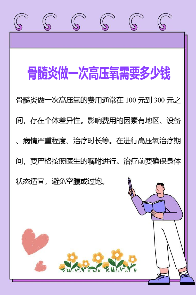 骨髓炎做一次高压氧的费用通常在 100 元到 300 元之间,存在个体差异性。影响费用的因素有地区、设备、病情严重程度、治疗时长等。