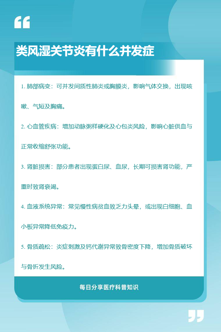 类风湿关节炎的并发症有肺部病变、心血管疾病、肾脏损害、血液系统异常、骨质疏松等。