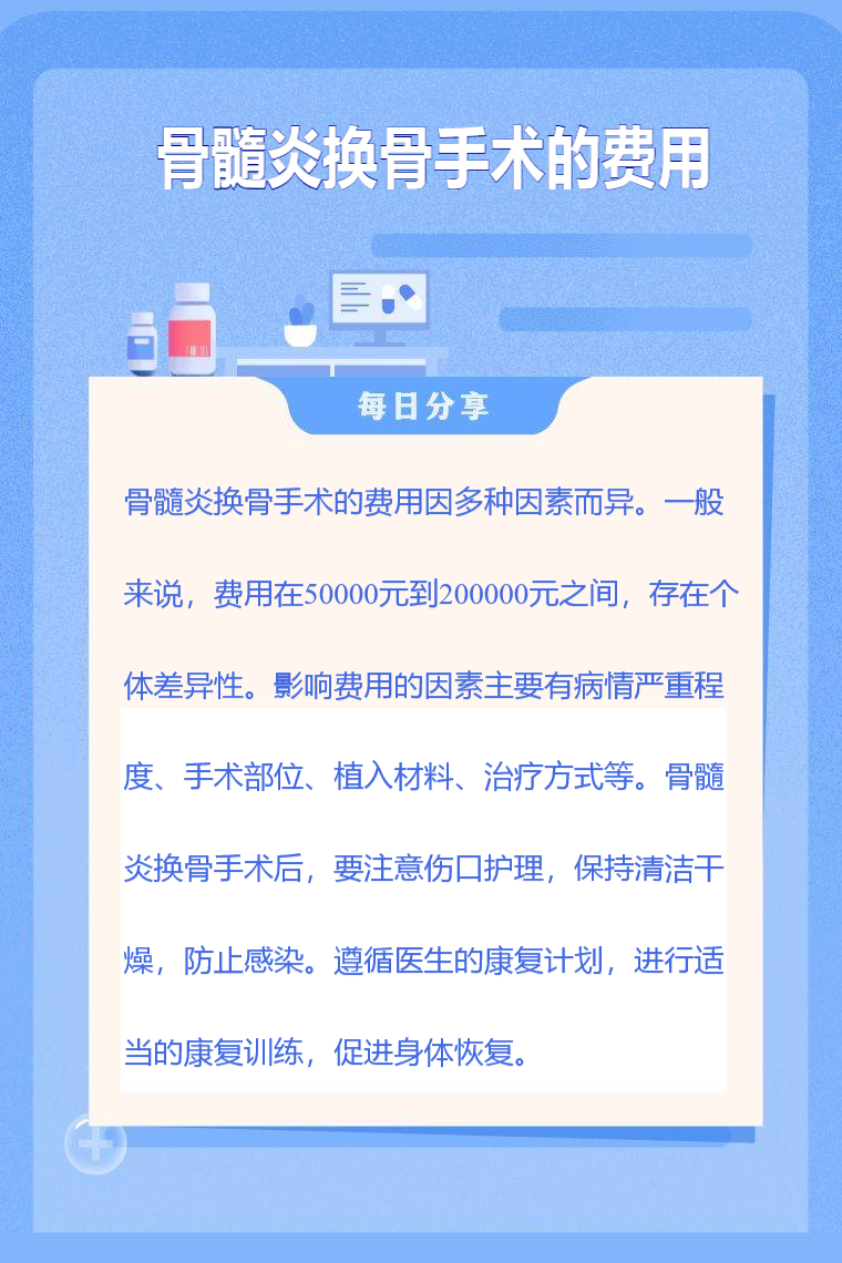 骨髓炎换骨手术的费用因多种因素而异。一般来说,费用在50000元到200000元之间,存在个体差异性。影响费用的因素主要有病情严重程度、手术部位、植入材料、治疗方式等。