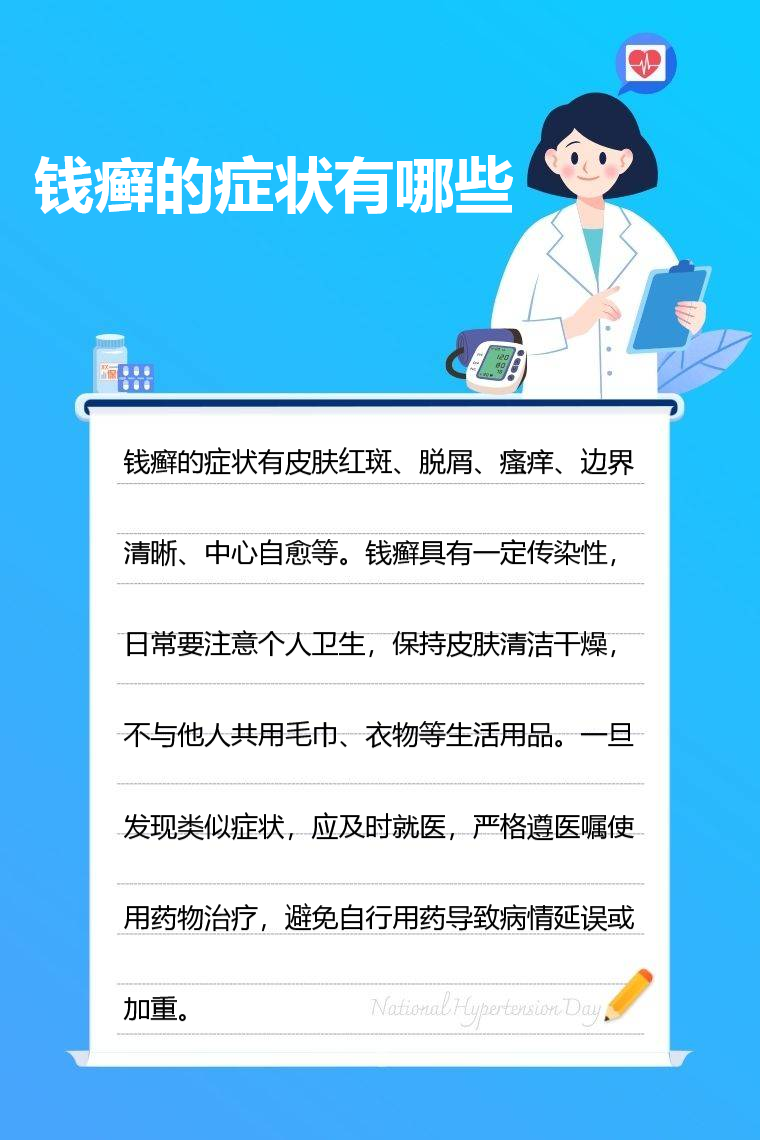 钱癣的症状有皮肤红斑、脱屑、瘙痒、边界清晰、中心自愈等。