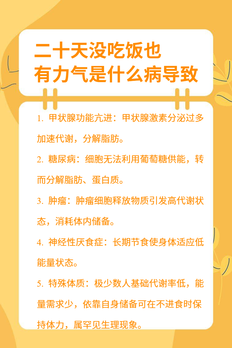 二十天没吃饭却有力气可能由甲状腺功能亢进、糖尿病、肿瘤、神经性厌食症、特殊体质等情况导致。