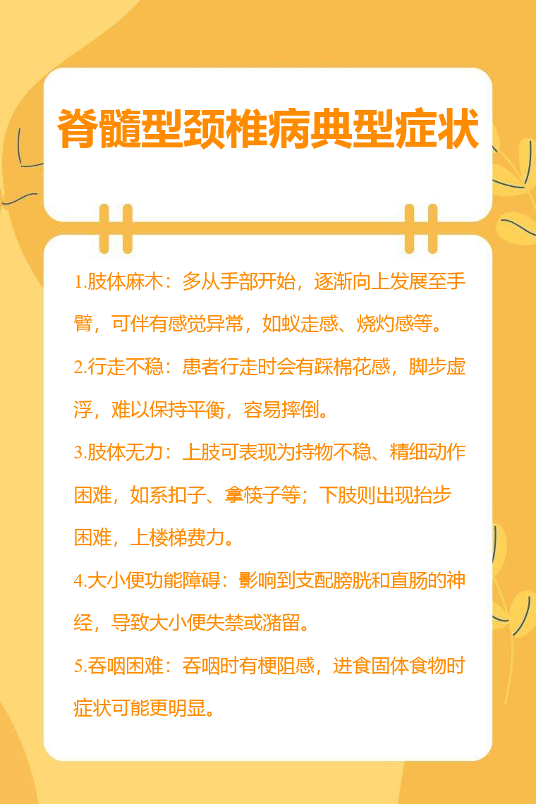 脊髓型颈椎病典型症状有肢体麻木、行走不稳、肢体无力、大小便功能障碍、吞咽困难等。