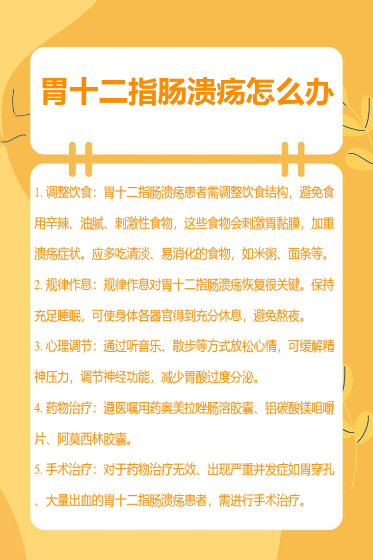胃十二指肠溃疡可通过调整饮食、规律作息、心理调节、药物治疗、手术治疗等方法应对。
