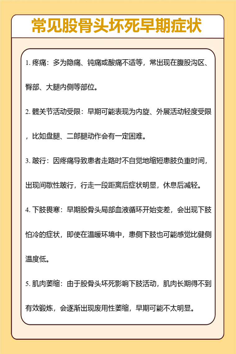 股骨头坏死早期症状有疼痛、髋关节活动受限、跛行、下肢畏寒、肌肉萎缩等。