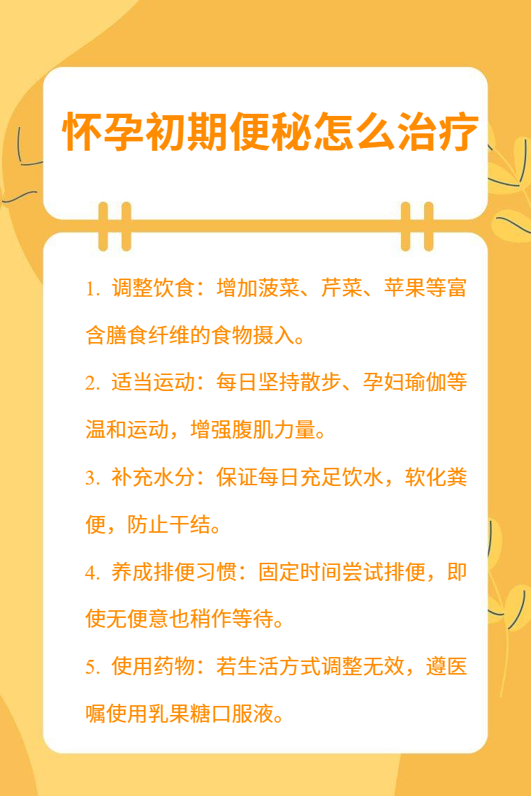 怀孕初期便秘可通过调整饮食、适当运动、补充水分、养成排便习惯、使用药物等方法治疗。
