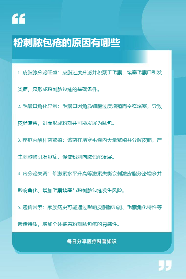 粉刺脓包疮的原因有皮脂腺分泌旺盛、毛囊口角化异常、痤疮丙酸杆菌繁殖、内分泌失调、遗传因素等。