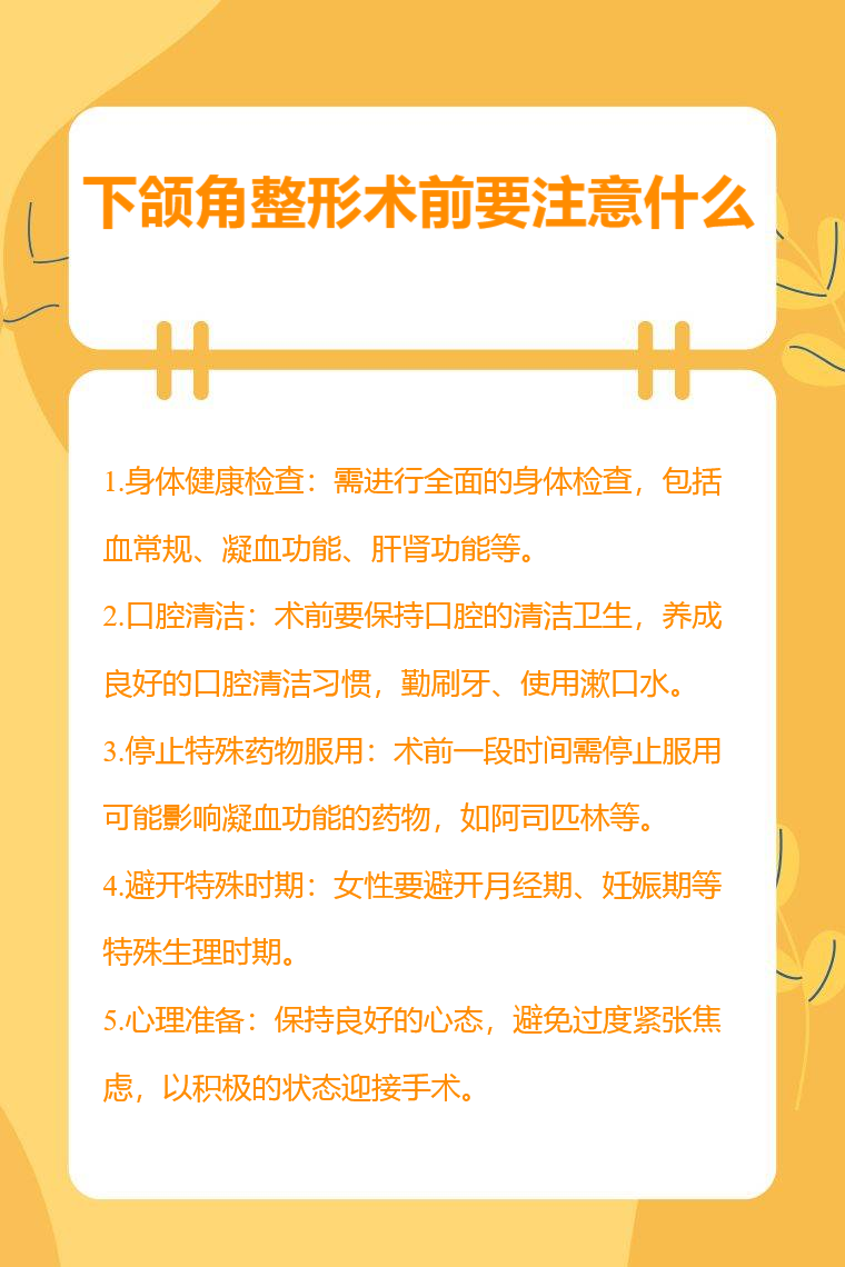 下颌角整形术前要注意身体健康检查、口腔清洁、停止特殊药物服用、避开特殊时期、心理准备等。