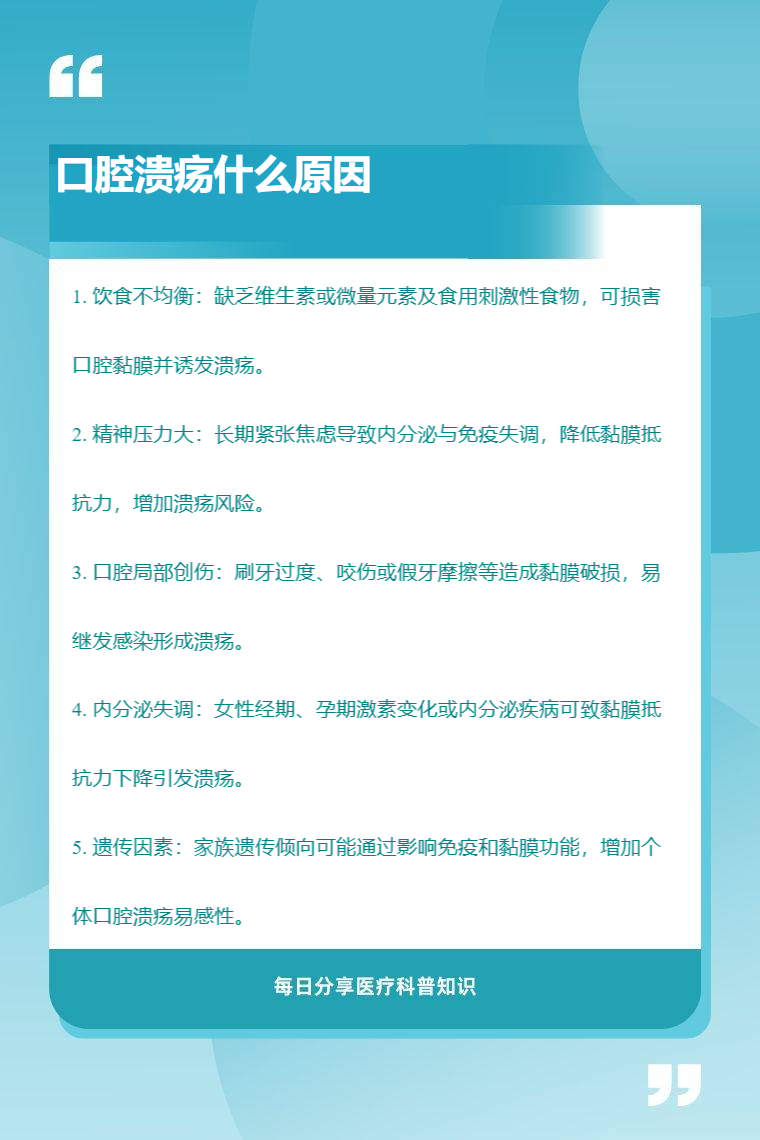 口腔溃疡的原因包括饮食不均衡、精神压力大、口腔局部创伤、内分泌失调、遗传因素等。