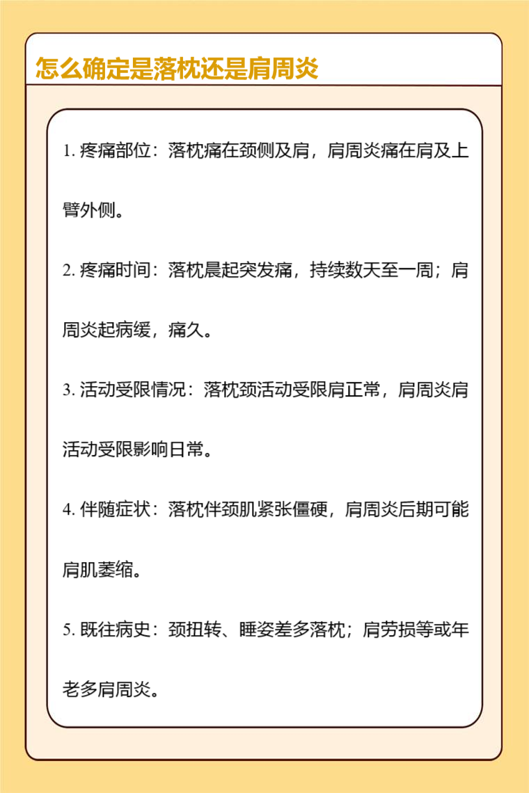 4. 伴随症状:落枕可能伴有颈部肌肉紧张、僵硬;肩周炎除疼痛和活动受限外,后期可能出现肩部肌肉萎缩。