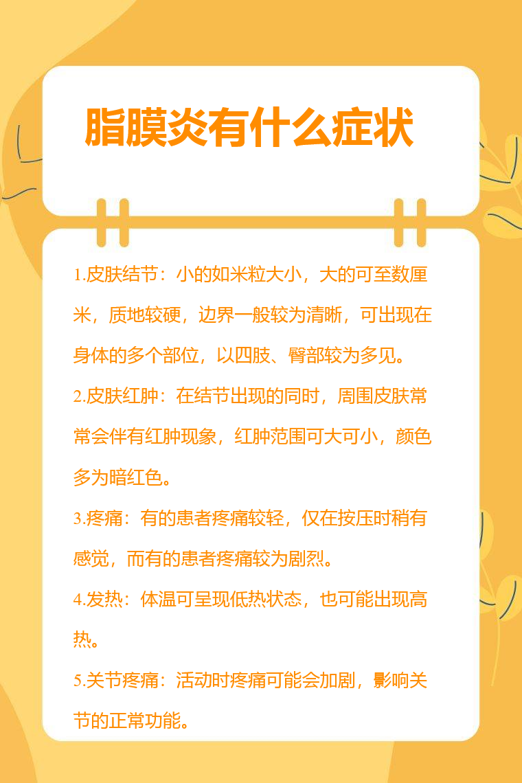 脂膜炎的症状包括皮肤结节、皮肤红肿、疼痛、发热、关节疼痛等。