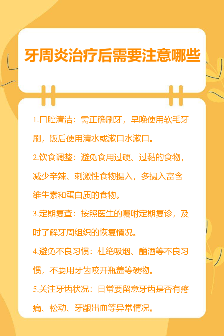 牙周炎治疗后需注意口腔清洁、饮食调整、定期复查、避免不良习惯、关注牙齿状况等。