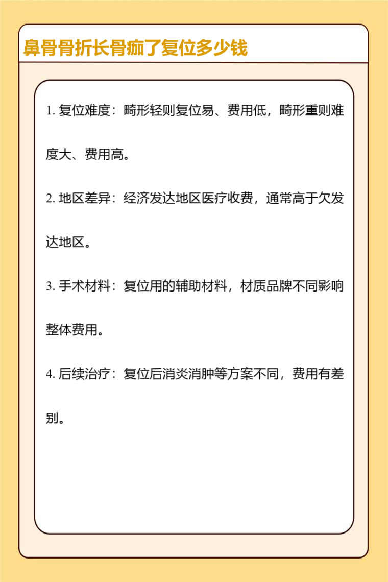 1. 复位难度:如果鼻骨骨折长骨痂后畸形程度较轻,复位操作相对简单,所需费用会较低;若畸形严重,增加了复位的难度,手术复杂程度提高,费用也会相应增加。