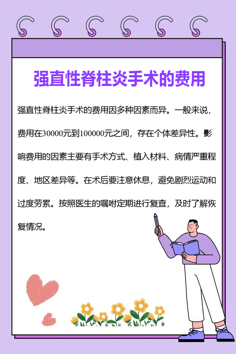 强直性脊柱炎手术的费用因多种因素而异。一般来说,费用在30000元到100000元之间,存在个体差异性。影响费用的因素主要有手术方式、植入材料、病情严重程度、地区差异等。