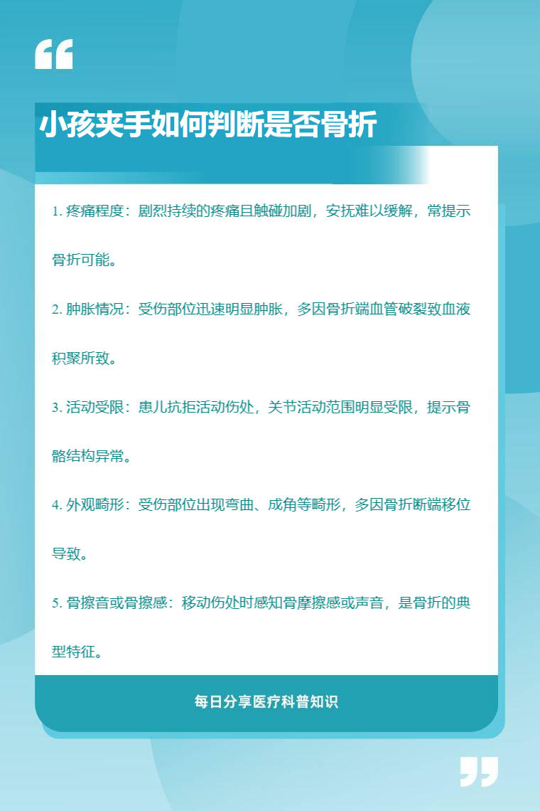 判断小孩夹手是否骨折可通过疼痛程度、肿胀情况、活动受限、外观畸形、骨擦音或骨擦感等。