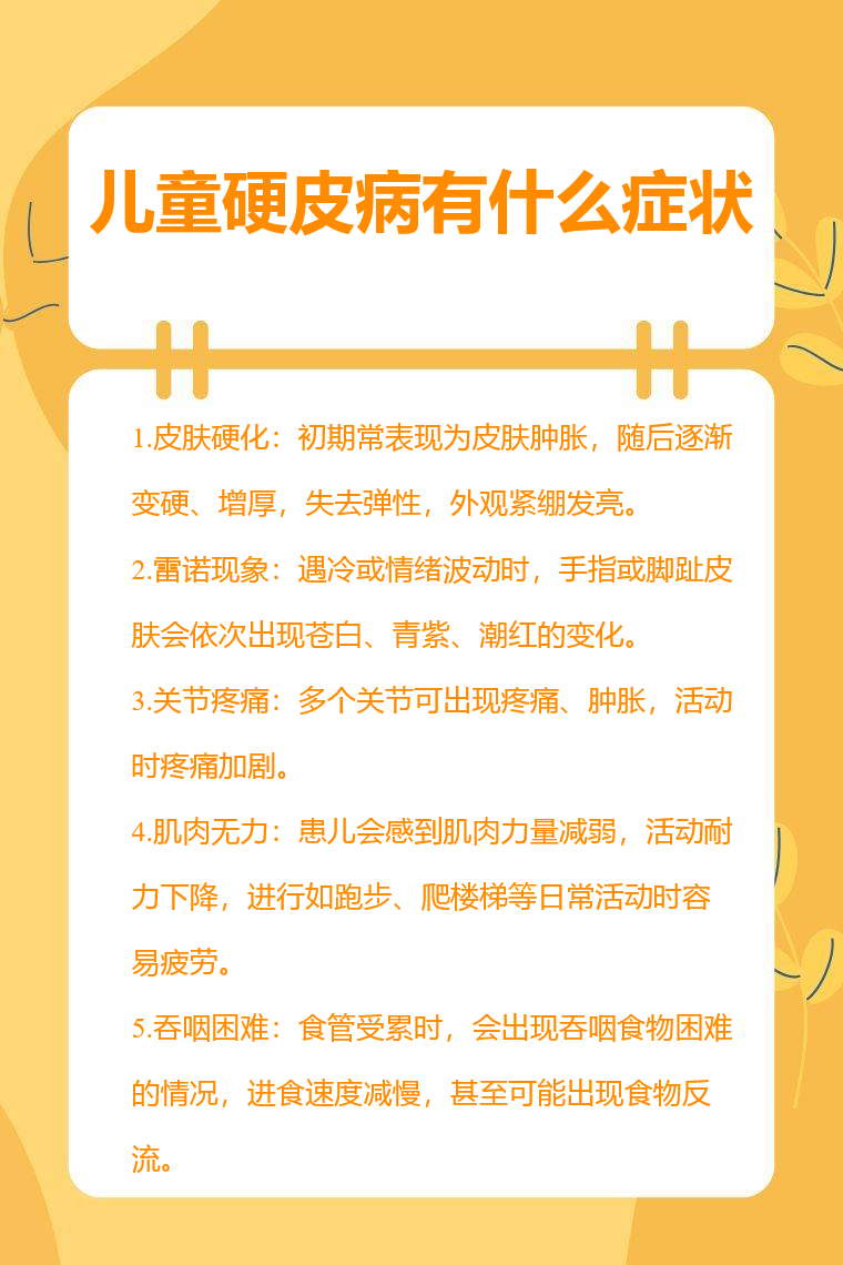 儿童硬皮病症状包括皮肤硬化、雷诺现象、关节疼痛、肌肉无力、吞咽困难等。