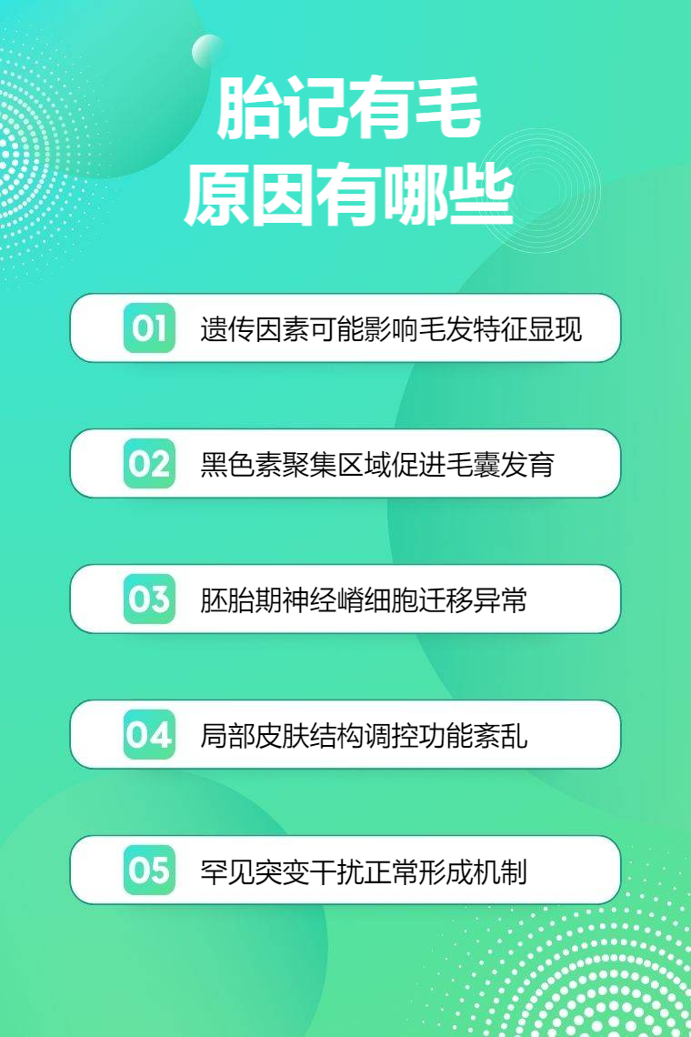 胎记有毛的原因常见的有基因遗传、黑色素细胞聚集、神经嵴细胞异常、局部皮肤发育异常、罕见基因突变等。