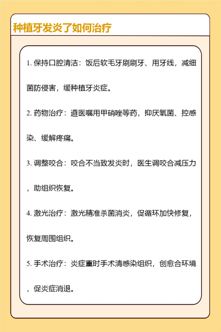 种植牙发炎可通过保持口腔清洁、使用药物治疗、调整咬合、激光治疗、手术治疗等方法来应对。