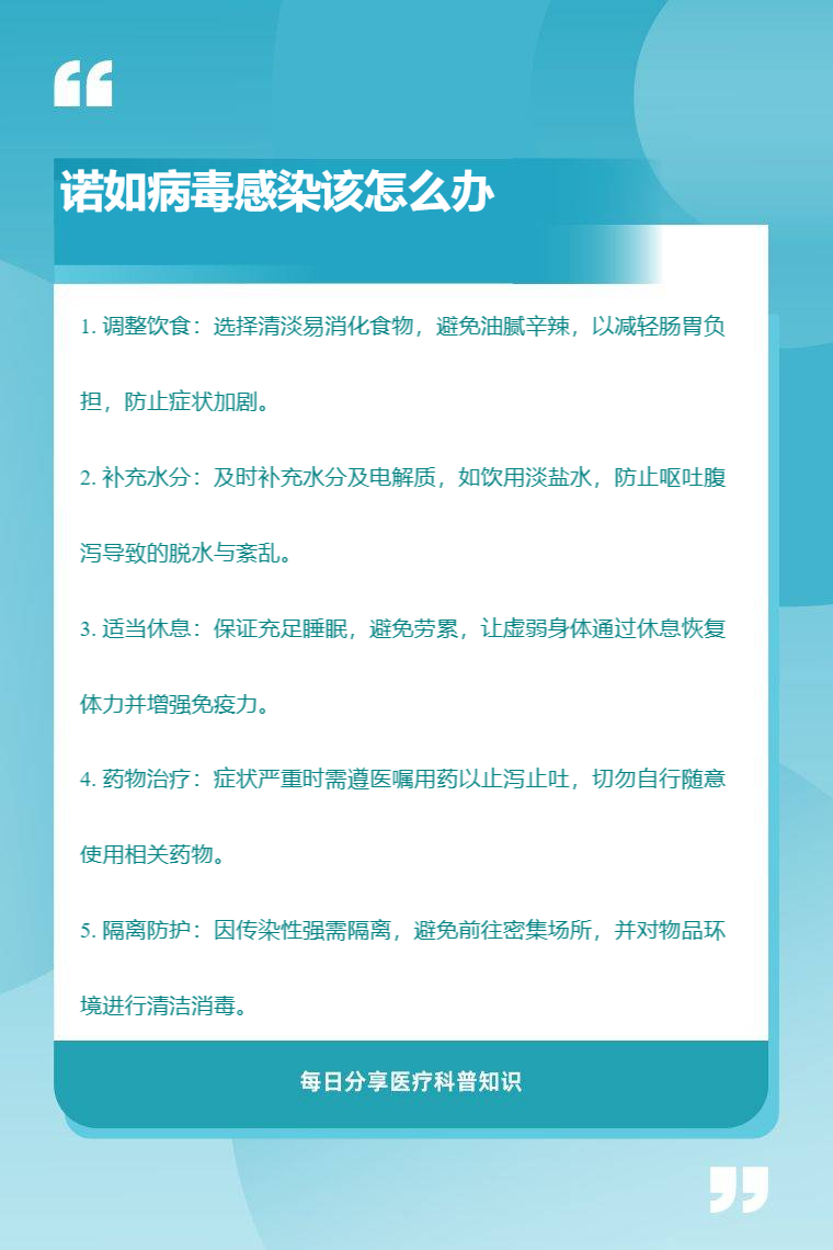 诺如病毒感染可通过调整饮食、补充水分、适当休息、药物治疗、隔离防护等应对。