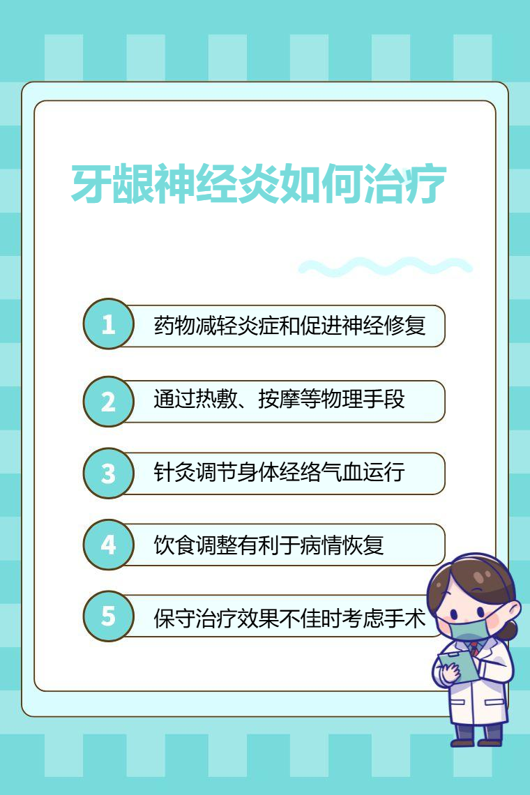 牙龈神经炎的治疗方法主要有药物治疗、物理治疗、中医针灸、饮食调整、手术治疗等。