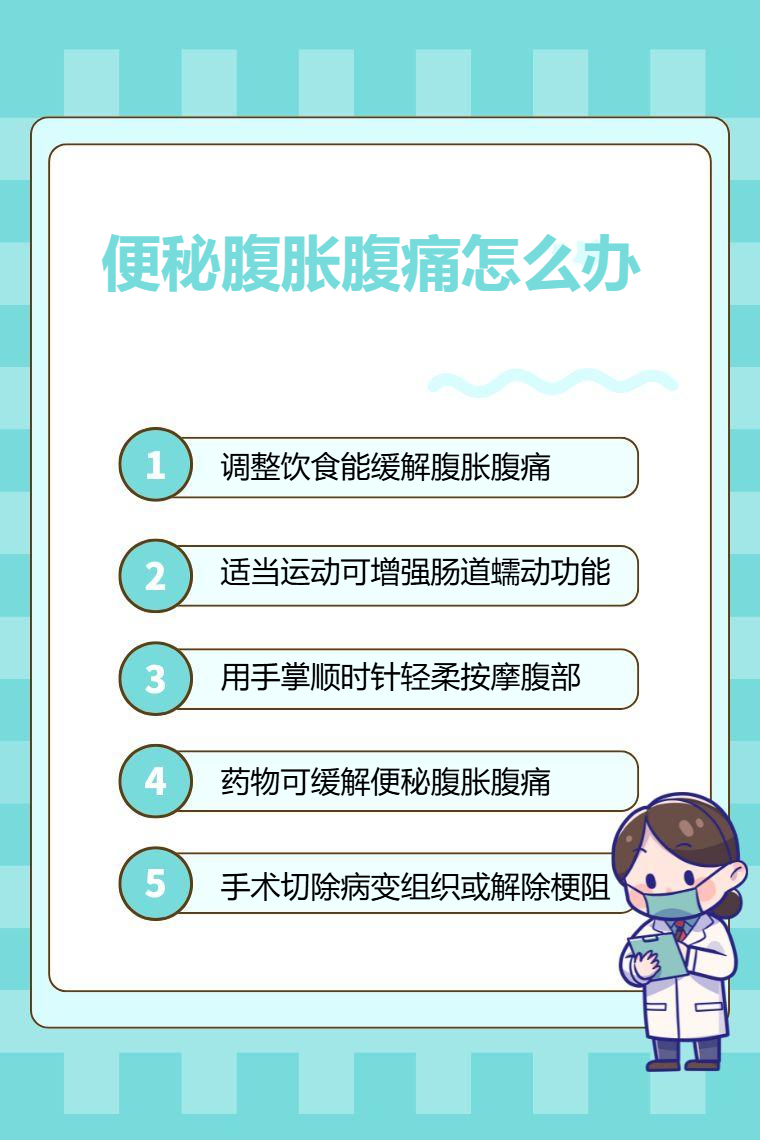 便秘腹胀腹痛可通过调整饮食、适当运动、腹部按摩、药物治疗、手术治疗等方法来缓解。