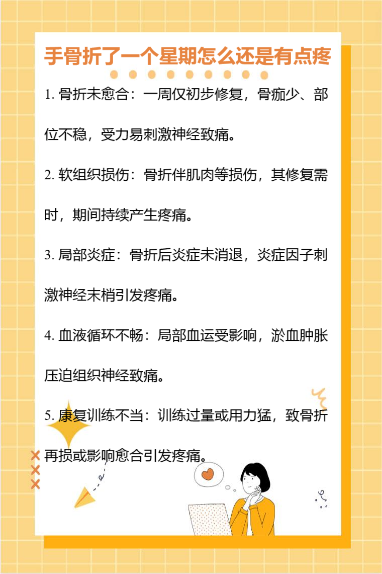 手骨折一个星期仍有点疼可能是骨折未愈合、软组织损伤、局部炎症、血液循环不畅、康复训练不当等。