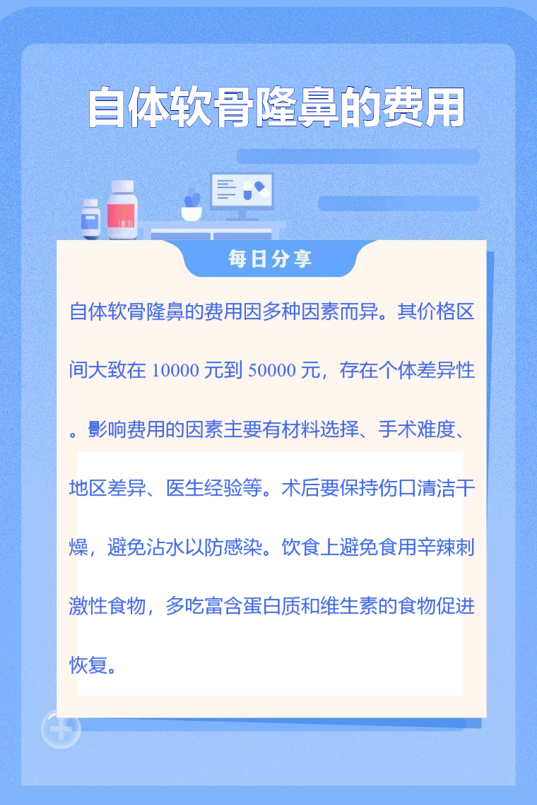 自体软骨隆鼻的费用因多种因素而异。其价格区间大致在 10000 元到 50000 元,存在个体差异性。影响费用的因素主要有材料选择、手术难度、地区差异、医生经验等。