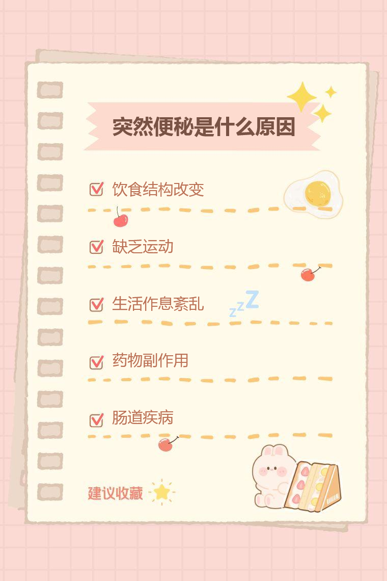 突然便秘的原因通常有饮食结构改变、缺乏运动、生活作息紊乱、药物副作用、肠道疾病等。