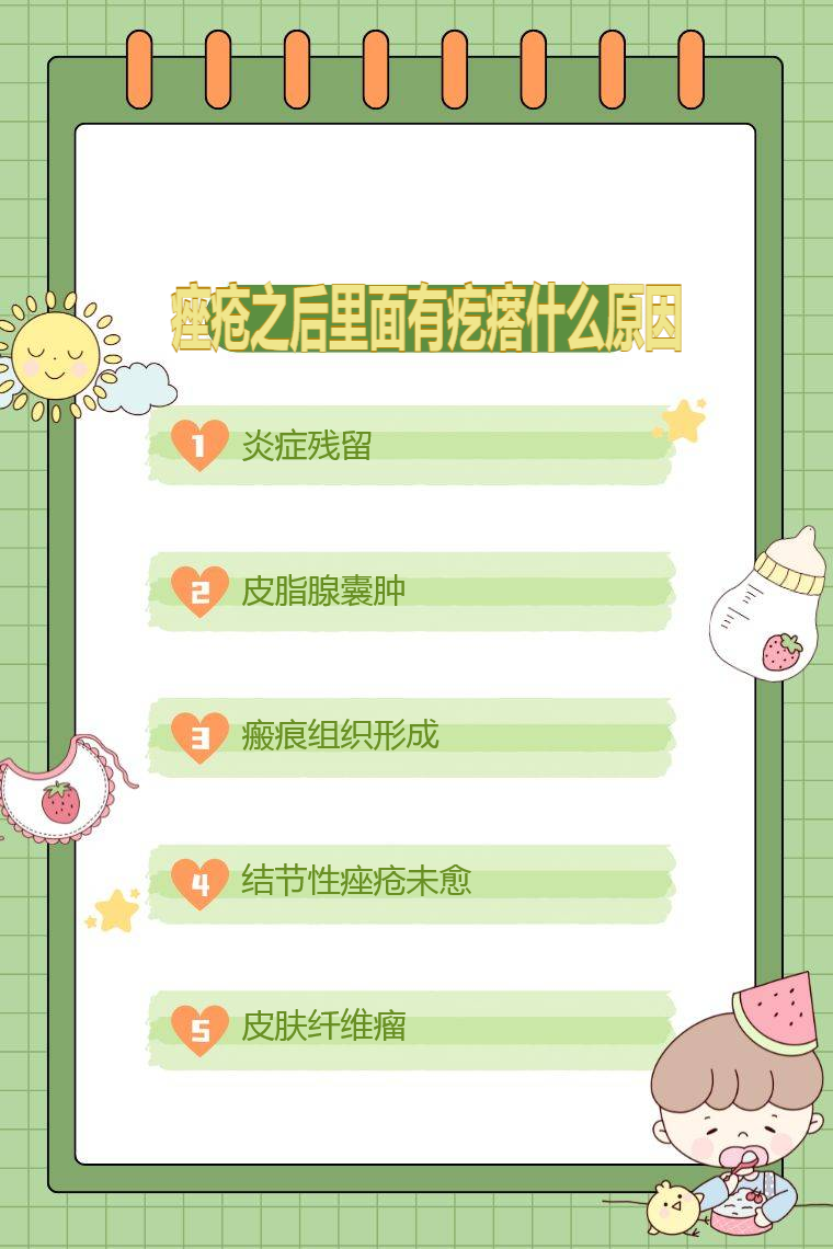 痤疮之后里面有疙瘩可能是由于炎症残留、皮脂腺囊肿、瘢痕组织形成、结节性痤疮未愈、皮肤纤维瘤等。