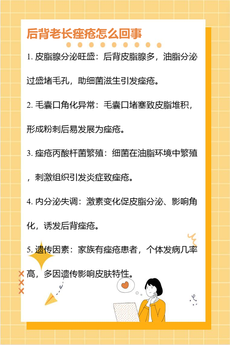 后背老长痤疮通常与皮脂腺分泌旺盛、毛囊口角化异常、痤疮丙酸杆菌繁殖、内分泌失调、遗传因素等有关。