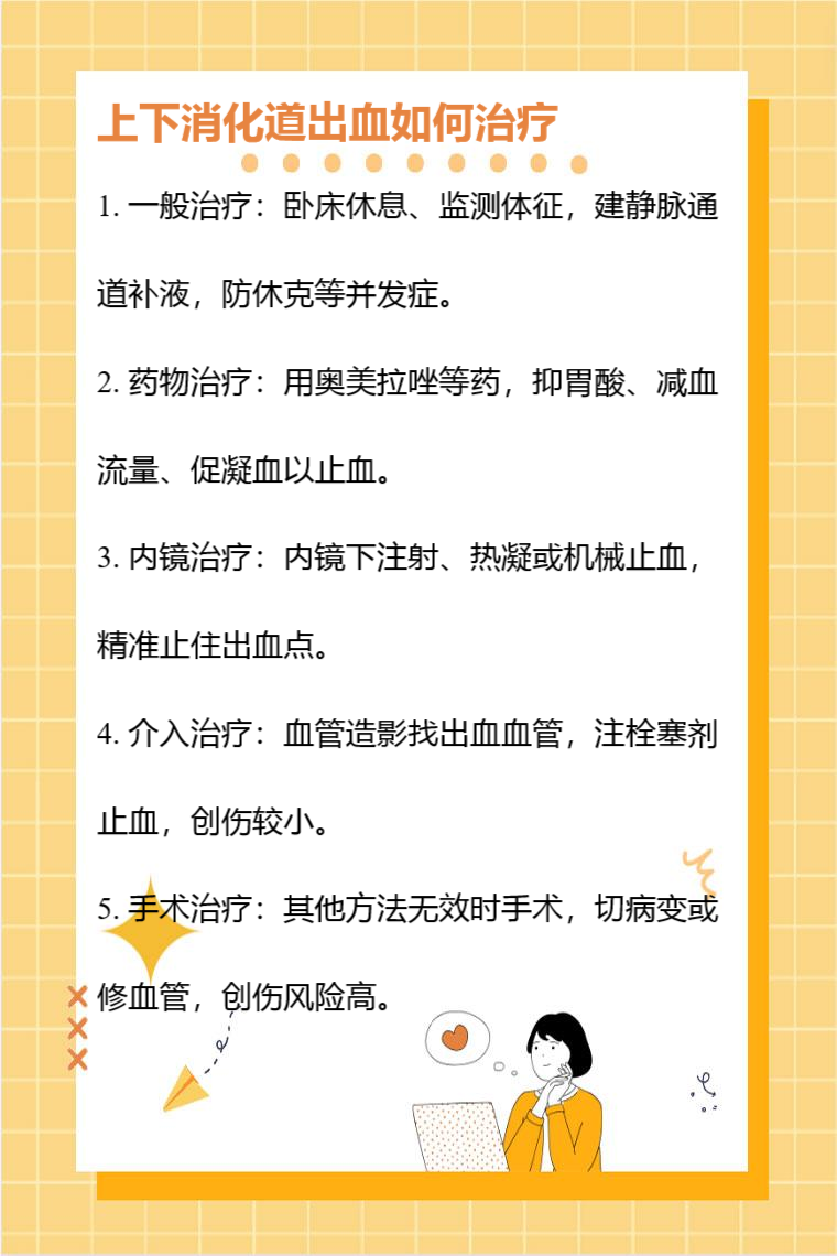 上下消化道出血的治疗方法主要有一般治疗、药物治疗、内镜治疗、介入治疗、手术治疗等。