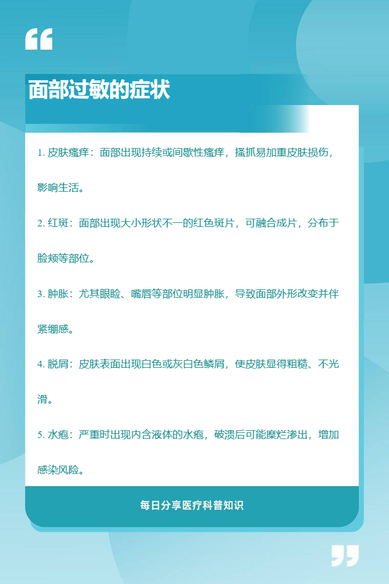面部过敏的症状包括皮肤瘙痒、红斑、肿胀、脱屑、水疱等。