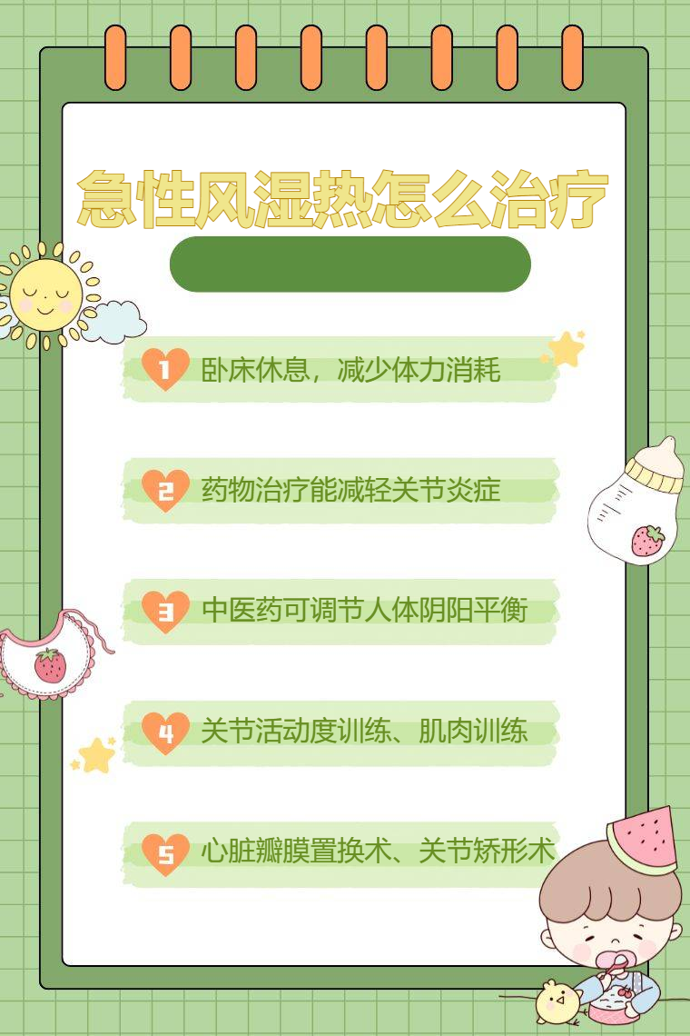 急性风湿热的治疗方法主要有一般治疗、药物治疗、中医药治疗、康复治疗、手术治疗等。