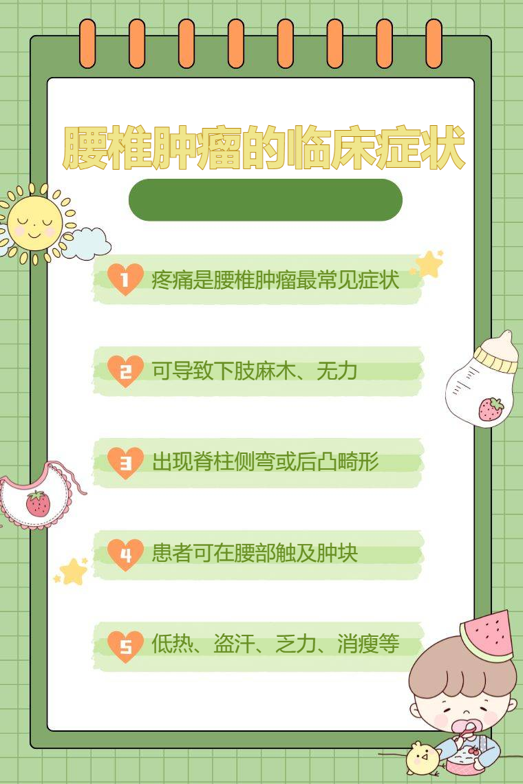 腰椎肿瘤的临床症状包括疼痛、神经功能障碍、脊柱畸形、肿块、全身症状等。