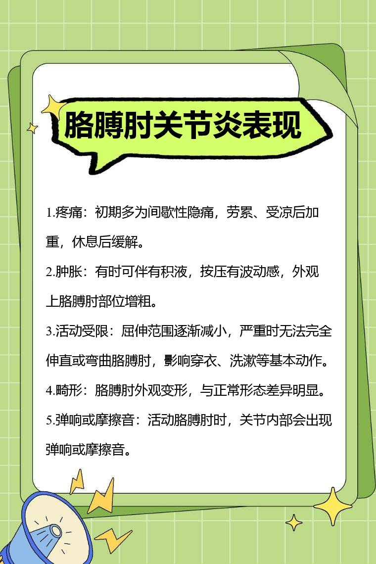 2.肿胀:炎症刺激可导致关节周围组织充血、水肿,出现明显肿胀。有时可伴有积液,按压有波动感,外观上胳膊肘部位增粗。