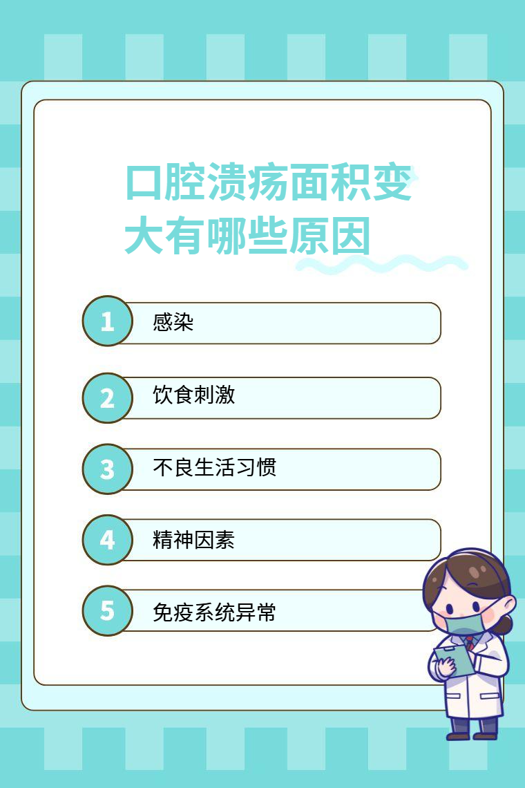 口腔溃疡面积变大的原因有感染、饮食刺激、不良生活习惯、精神因素、免疫系统异常等。