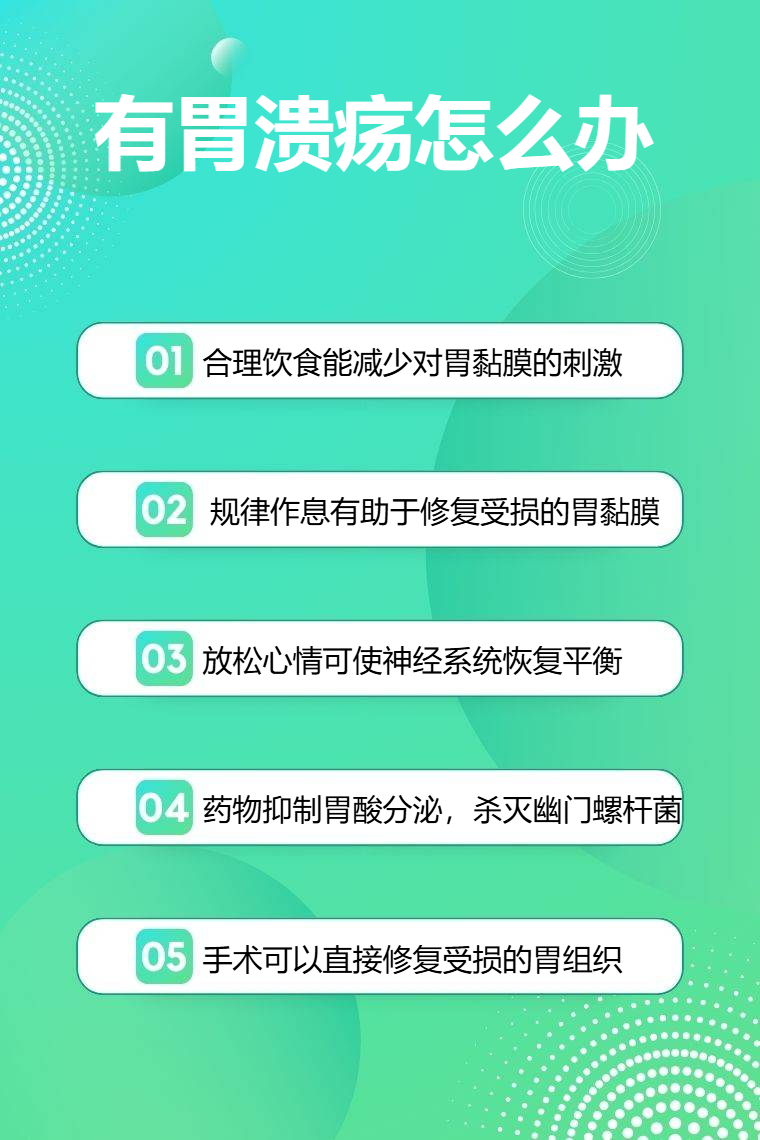胃溃疡可通过调整饮食、规律作息、心理调节、药物治疗、手术治疗等方法应对。