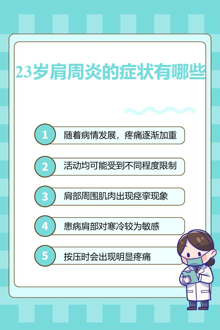 23岁肩周炎的症状有肩部疼痛、活动受限、肌肉痉挛、肩部怕冷、压痛等。