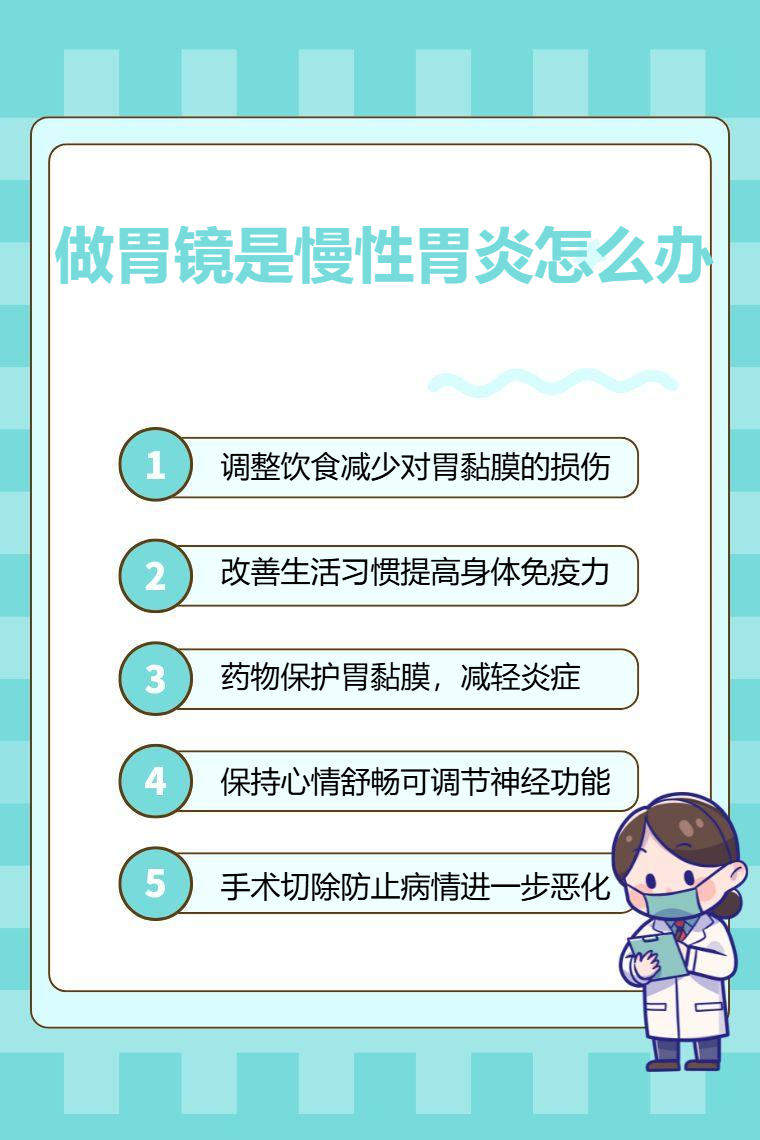 慢性胃炎的治疗可通过调整饮食、改善生活习惯、药物治疗、心理调节、手术治疗等。