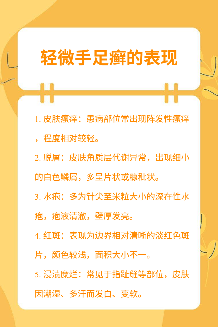 轻微手足癣的表现有皮肤瘙痒、脱屑、水疱、红斑、浸渍糜烂等。