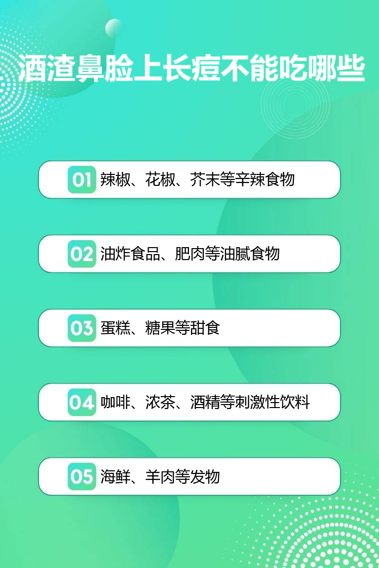 酒渣鼻患者脸上长痘一般不能吃辛辣食物、油腻食物、甜食、刺激性饮料、发物等。