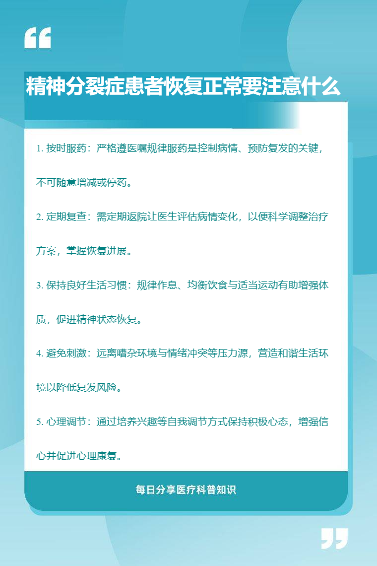 精神分裂症患者恢复正常要注意按时服药、定期复查、保持良好生活习惯、避免刺激、心理调节等。