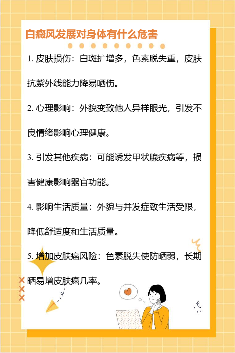 白癜风发展对身体的危害包括皮肤损伤、心理影响、引发其他疾病、影响生活质量、增加皮肤癌风险等。