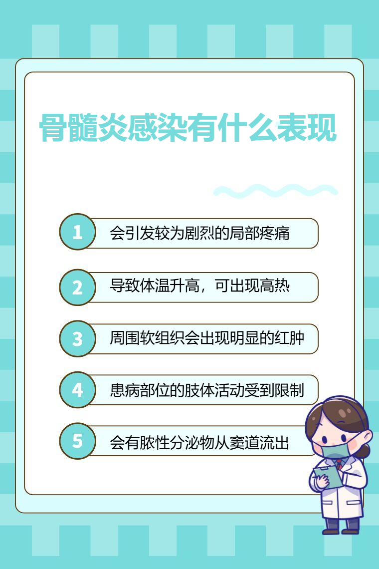 骨髓炎感染若不及时治疗,可能导致严重后果。日常要注意保持良好的卫生习惯,避免外伤,降低感染风险。一旦出现上述症状,应及时就医,严格遵医嘱进行规范治疗,包括使用抗生素、必要时手术等,以促进病情康复,防止病情恶化。